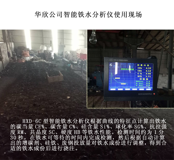 HXD-6C型智能鐵水管理儀是南京華欣分析儀器制造有限公司經(jīng)過多年研究,具有自主知識產(chǎn)權(quán)、測量精度更高、性能更穩(wěn)定、國內(nèi)先進的一代爐前鐵水質(zhì)量管理儀。鑄鐵爐前快速熱分析技術(shù)是以鑄鐵組織形成過程的凝固溫度曲線為被測對象,儀器對凝固溫度曲線進行分析,得到不同成份下曲線的特征點。根據(jù)曲線的特征點計算出鐵水的碳當量CE%、碳含量C%、硅含量Si%、球化率SG%、抗拉強度RM、共晶度SC、硬度HB等鐵水性能。檢測時間約為1分30秒,在鐵水可等待的時間內(nèi)完成檢測,然后根據(jù)自動計算出的增碳劑、硅鐵、廢鋼投放量對鐵水成份進行調(diào)整,得到合適的鐵水成份后進行澆注。