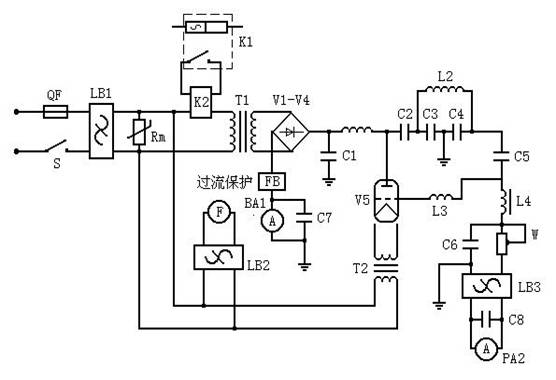 打開高頻紅外碳硫分析儀面板上的電源開關(guān),220V 交流電壓經(jīng)電源濾波器 LB1后分三路分別供整機工作,一路經(jīng)濾波器 LB2供軸流風機 F 工作,一路供燈絲變壓器 T2工作,一路經(jīng)固態(tài)繼電器 K2控制供高壓電路工作。
